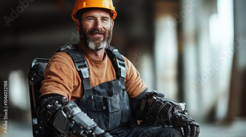 A smiling construction worker wearing a robotic exoskeleton onsite, representing technological advancement and empowerment in modern industrial environments.