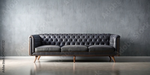Low angle view of dark tufted sofa against mid century modern blank wall
