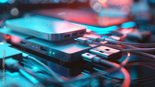 Sleek USB hub with multiple ports connected to various devices, showcasing modern design and functionality in a tech-focused setup.