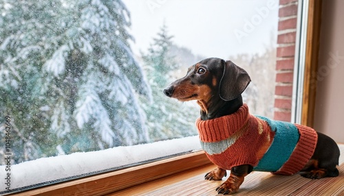 雪が降り積もる外を眺めるミニチュアダックスフント、その可愛らしい姿が冬の雰囲気を演出