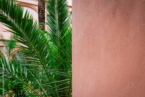 a textured background with pink stucco wall detail and green palm leaves. half and half with modern colours. copy space graphic design background resource for blog articles