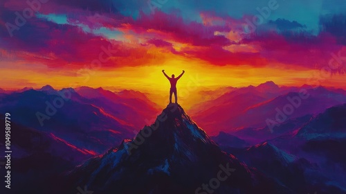 Stunning Silhouette of a Triumphant Hiker on Mountain Peak Against Vibrant Sunset Sky