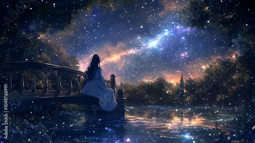 Girl Gazing at Stars from Ancient Wooden Bridge