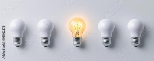 Single illuminated lightbulb among others, symbolizing a bright idea or innovation
