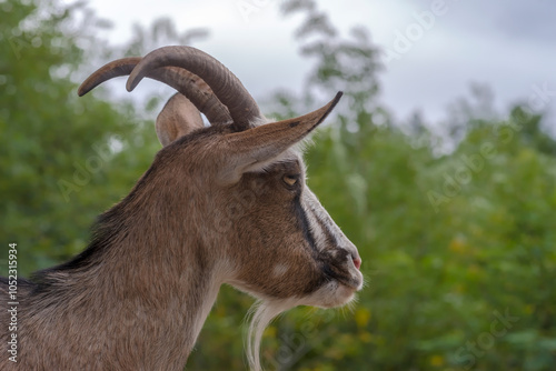 Koza z imponującymi rogami i (nie mniej imponującą) brodą na tle zieleni. Rogata bestia patrzy przed siebie, jakby pogrążona w „kontemplacyjnej myśli”.