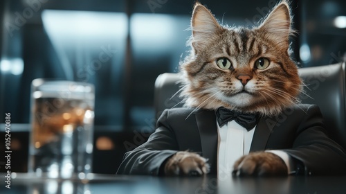 A sophisticated, well-dressed cat sits poised at a polished table, dressed in a tuxedo and bowtie, radiating charm and charisma in an indoor setting.