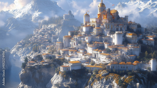 Village heroic fantasy perché sur un rocher avec murs blancs et toits dorés
