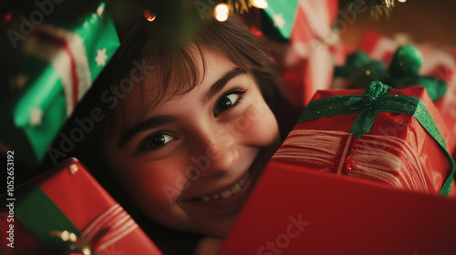 Uśmiechnięta nastolatka siedzi obok pięknie przystrojonej choinki, ciesząc się z nadchodzących świąt. Wokół niej leżą kolorowe prezenty, starannie zapakowane w papier.