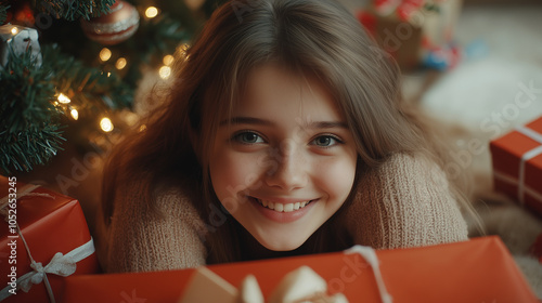 Uśmiechnięta nastolatka siedzi obok pięknie przystrojonej choinki, ciesząc się z nadchodzących świąt. Wokół niej leżą kolorowe prezenty, starannie zapakowane w papier.