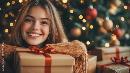 Uśmiechnięta nastolatka siedzi obok pięknie przystrojonej choinki, ciesząc się z nadchodzących świąt. Wokół niej leżą kolorowe prezenty, starannie zapakowane w papier.