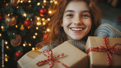 Uśmiechnięta nastolatka siedzi obok pięknie przystrojonej choinki, ciesząc się z nadchodzących świąt. Wokół niej leżą kolorowe prezenty, starannie zapakowane w papier.