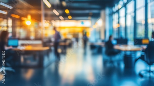 A blurred modern office space filled with business people engaged in various tasks,