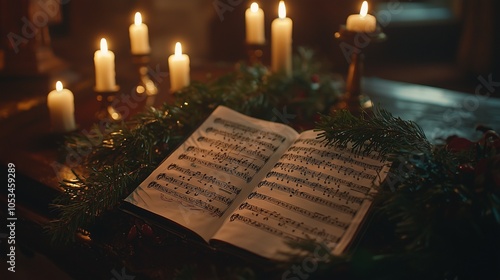 Open hymn book with candles and greenery, symbolizing christmas music in a church setting.