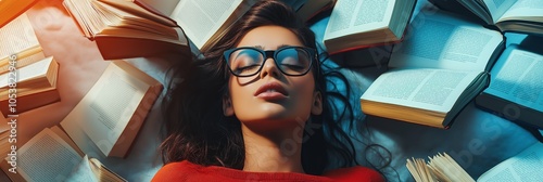 A woman wearing glasses lies among open books, seemingly falling asleep, embodying a moment of intellectual reading and knowledge gathering.