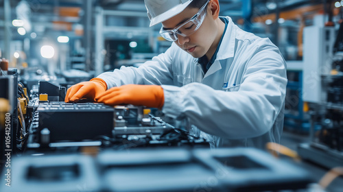W fabryce pojazdów elektrycznych chiński inżynier pracuje nad ogniwami baterii, koncentrując się na detalach modułu.