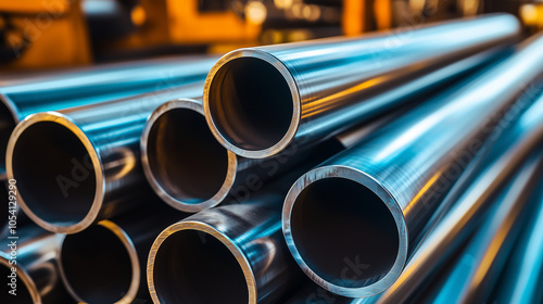 Na tle stalowych rur o błyszczącej powierzchni, ułożonych w starannie zorganizowany stos, widać doskonałą jakość metalu.