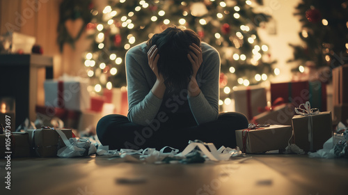 Person Sitting Alone with Head in Hands Amid Christmas Gifts, Struggling with Holiday Depression and Loneliness, Image made using Generative AI