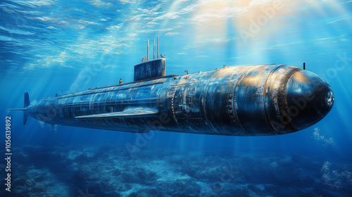Wojskowa łódź podwodna z charakterystycznym kadłubem zanurza się w mrocznych wodach.