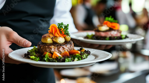 Kelner, ubrany w elegancki strój, z pewnością niesie talerze z wykwintnymi daniami mięsnymi podczas przyjęcia weselnego.