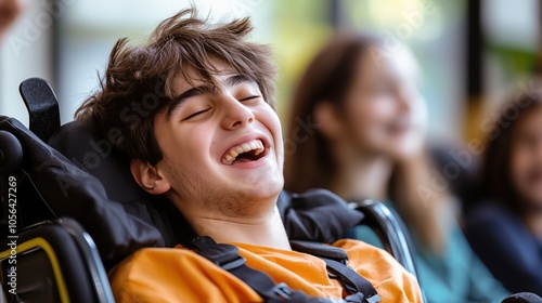 Teenage boy with cerebral palsy laughing joyfully, concept of inclusivity and happiness