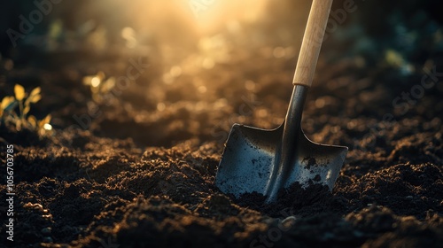 A solitary shovel is embedded in a patch of earth its wooden handle rising from the soil and the metallic blade catching the sun s rays in a soft focused backdrop