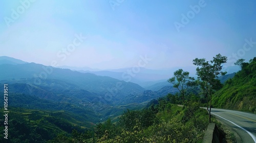 The allure of a landscape filled with the beauty of blue sky, fluffy white clouds, majestic high mountains, and vibrant green plants. Generative AI