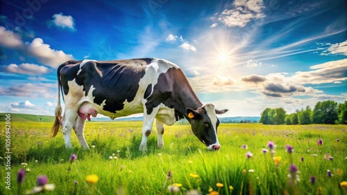 Serene Summer Pasture with Holstein Cow Chewing Cud Under Clear Blue Sky - Perfect Profile View for Stock Photography