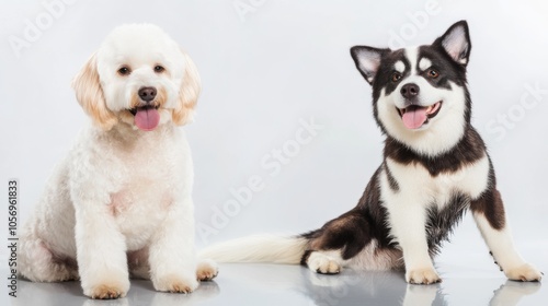 Two adorable dogs sit together, showcasing their unique personalities and playful spirits in a bright, cheerful setting.
