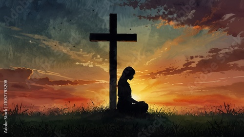 The Girl Kneeling and Praying at Cross in Sunset Field