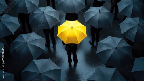 An overhead view of a crowd holding umbrellas with a single yellow umbrella standing out. Concept of being different.