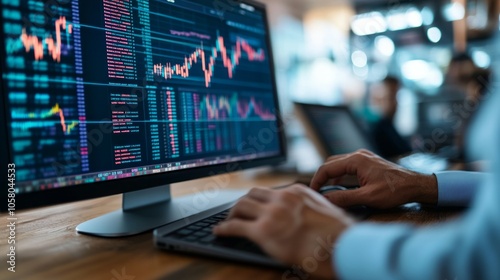 Stock traders pointing highest stock market on dynamic valued analysis on monitor real time screen, cooperating business investment in financial company to plan successful stock exchange. Sellable.