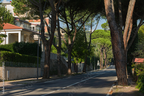 Vista del viale alberato di pini che porta a Montecatini Alto durante un caldo tramonto autunnale con la luce del sole che filtra attraverso i rami degli alberi.