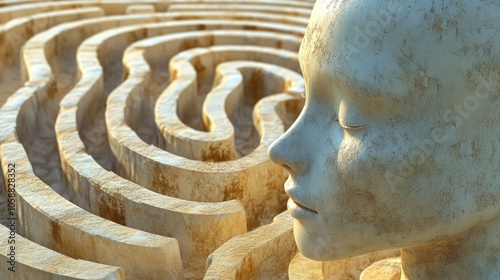 An artistic depiction featuring a curved human head alongside a circular labyrinth design