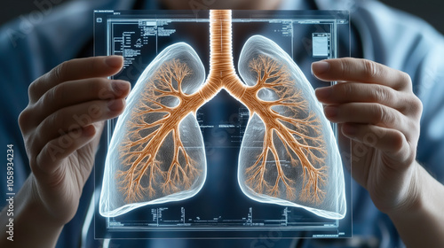 Close-up of a person holding a transparent digital panel displaying detailed 3D anatomical diagram of human lungs with visible trachea and bronchial branches.