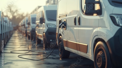 A row of white electric vans charging at a station during golden hour, highlighting the shift to sustainable transport.