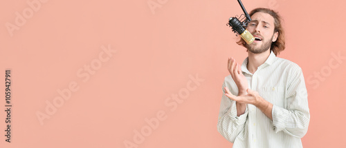 Handsome young man singing in microphone on color background