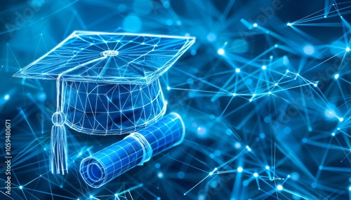 Digital graduation cap with Diploma certificate icon in low poly wireframe,banner education technology and e-learning platforms, learning and academic achievement. mba graduation hat.