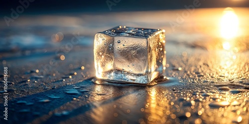 A crystalline cube of ice, glistening with captured sunlight, rests on a surface of shimmering drops, reflecting the golden hues of the setting sun.