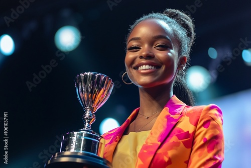 A young Black businesswoman in a bright suit, receiving an award on stage, proud smile beaming under the spotlight, medium close-up of her face and trophy 4