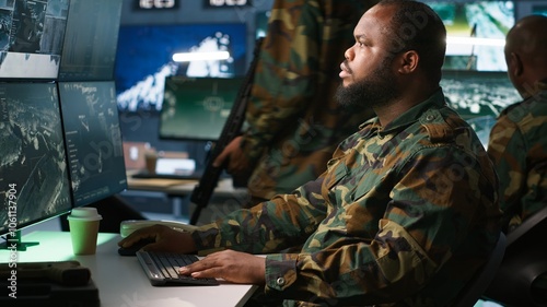 Military soldier in mission command post overseeing national safety operations, talking on phone. African american army expert in telephone call in monitoring room, camera A