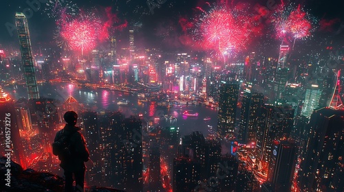 Night city with fireworks, beautiful night cityscape illuminated by fireworks.