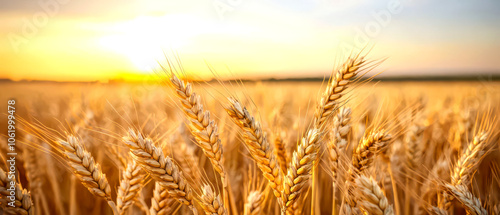 Close up view of golden wheat ears in a sunlit field during harvest season, showcasing nature's bounty.