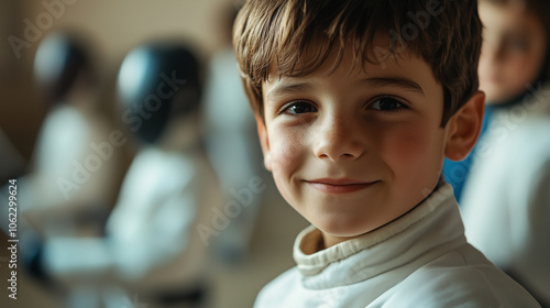 Młody chłopiec z szerokim uśmiechem stoi w pełnym stroju szermierczym, trzymając w ręku lekką szpadę.