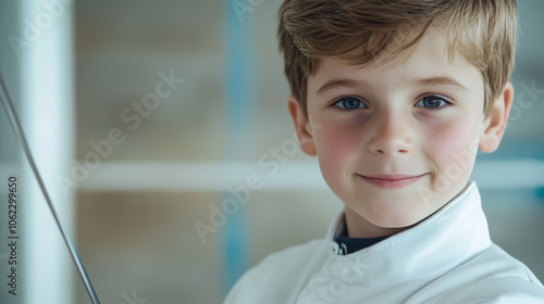 Młody chłopiec z szerokim uśmiechem stoi w pełnym stroju szermierczym, trzymając w ręku lekką szpadę.