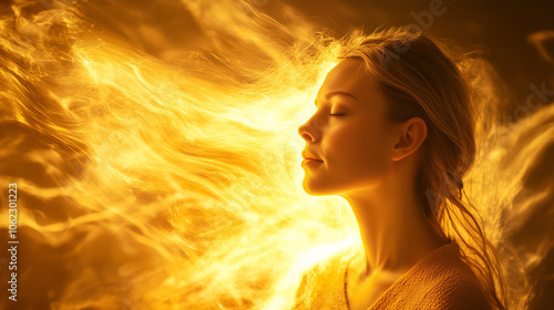 Kobieta w chwili skupienia, wykonująca terapię energetyczną, emanuje wewnętrzną siłą. Wokół jej ciała krąży jasna energia, z dynamicznymi kształtami i kolorami.