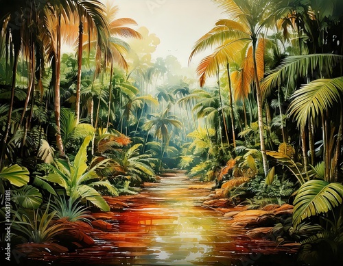 Tropikalna dżungla o zachodzie słońca, obraz akrylowy
