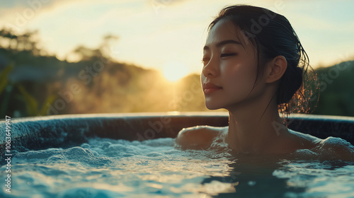 W blasku zachodzącego słońca, Azjatka o spokojnym wyrazie twarzy korzysta z gorącego spa, zanurzonego w atmosferze relaksu.