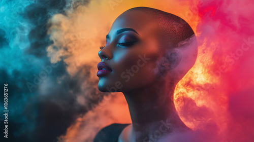 Czarnoskóra kobieta z łysiną, otoczona tłem z kolorowego dymu.