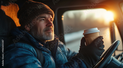 Kierowca ciężarówki robi przerwę, delektując się gorącą kawą z kubka, podczas gdy jego pojazd stoi na poboczu drogi.