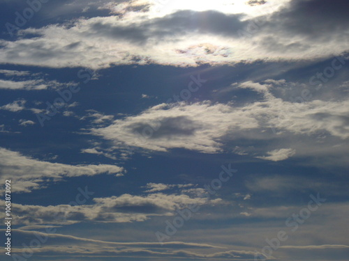 Blue sky with sun behind clouds and sunlight - natural background. Topics: sun energy, weather, meteorology, atmosphere, air space